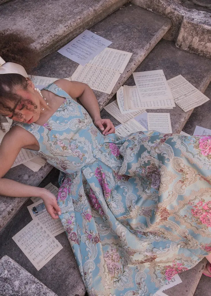 The Emery Dress is a timeless statement piece, featuring luxurious jacquard fabric adorned with intricate floral and vintage-inspired patterns. Its elegant fit-and-flare silhouette highlights a structured bodice and a pleated skirt for effortless sophistication. Perfect for weddings, galas, or any formal occasion, this dress combines classic charm with modern elegance.